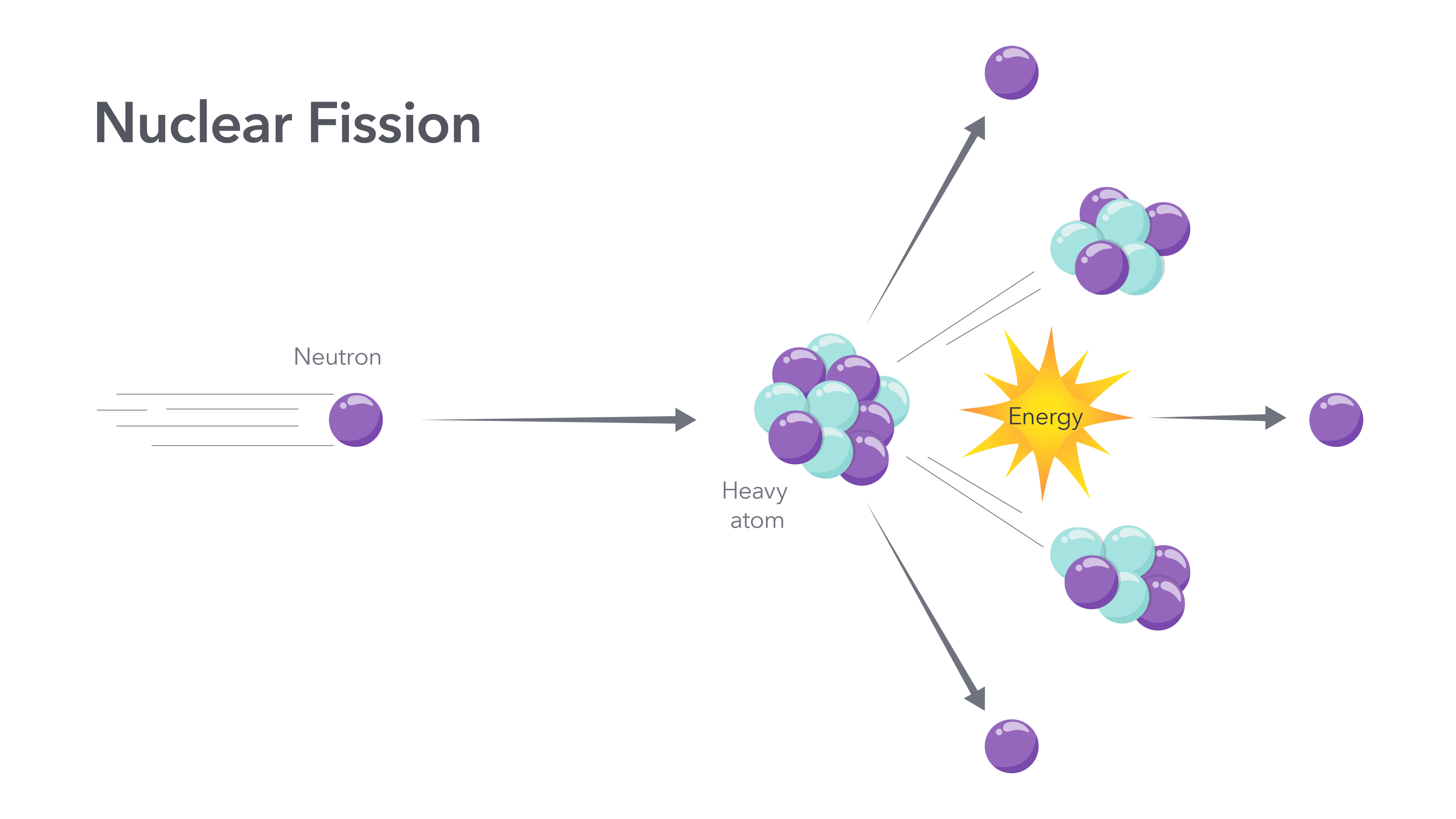 Existing nuclear power plants generate energy and electricity through a process called fission. Fission is a process where a neutron collides with a uranium atom and splits it, releasing energy in the form of heat and radiation. Heat can be converted into electricity at the power plant. The heat boils water, creating steam that spins a turbine that produces electricity. The electricity is carried to customers, while the plant keeps producing energy because the neutrons keep colliding with other uranium atoms in a process called a nuclear chain reaction. The nuclear fission process creates radioactive nuclear waste that needs to be disposed of properly and stored in a safe area.